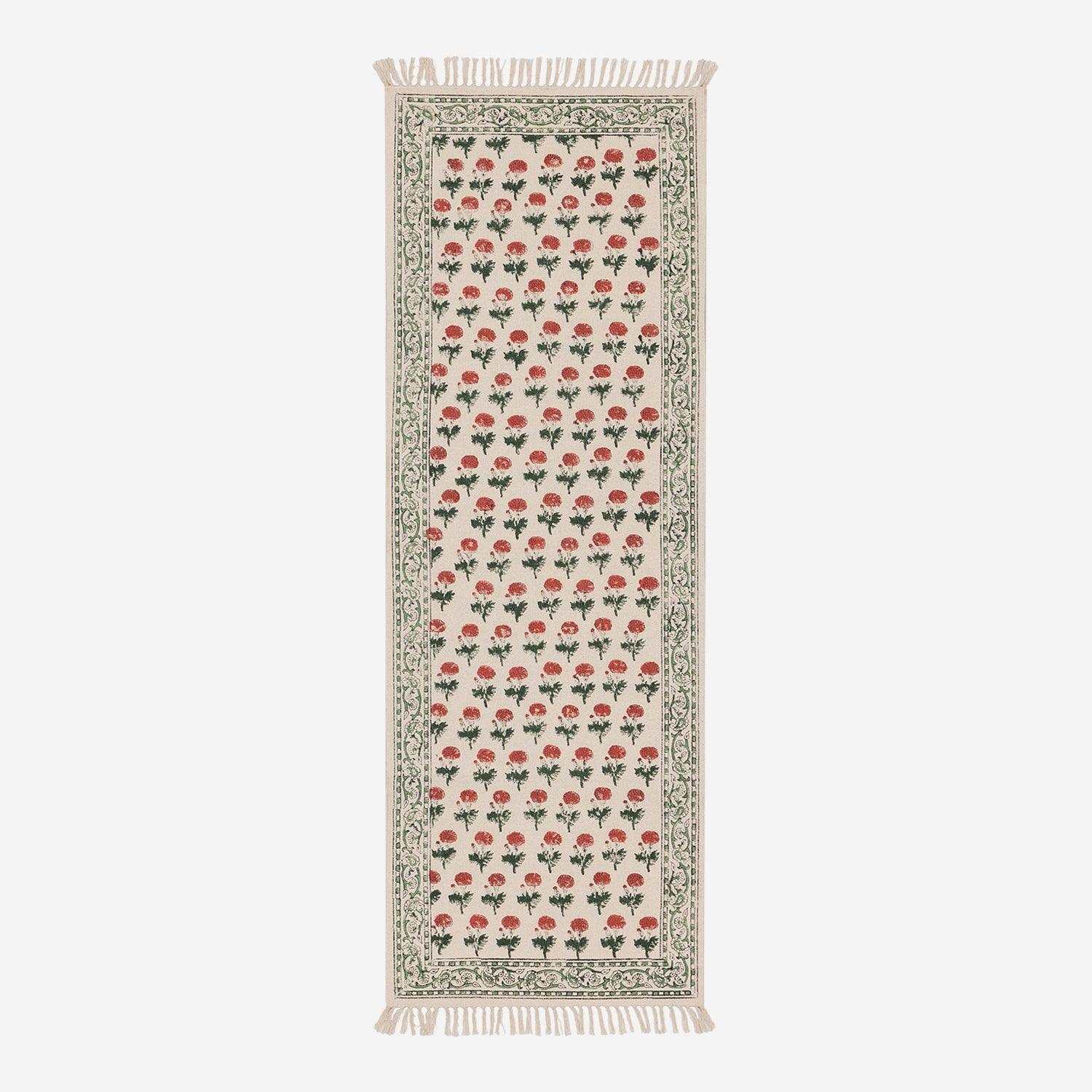 Compact cotton rug with Kalamkari floral pattern in delicate hues of pink against a white background.