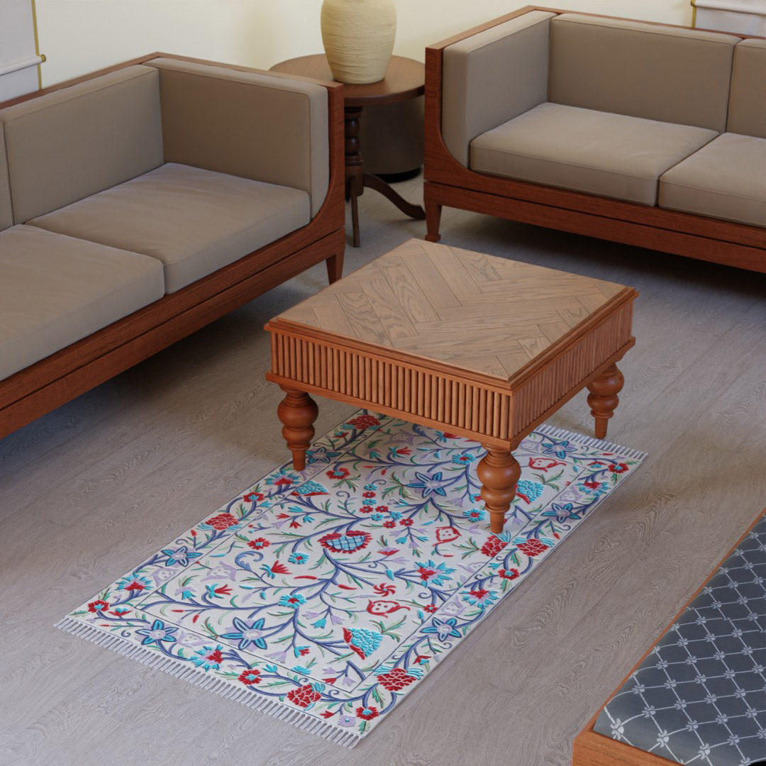 This handcrafted woollen rug with a traditional pattern with a central focus and all-over floral and vine motifs in blue and red against an off-white base, creating a rich and vibrant look. Made in traditional Namda style, the rug adds warmth and colour to living rooms, bedrooms, or study areas. Its intricate embroidery makes it a beautiful centrepiece.