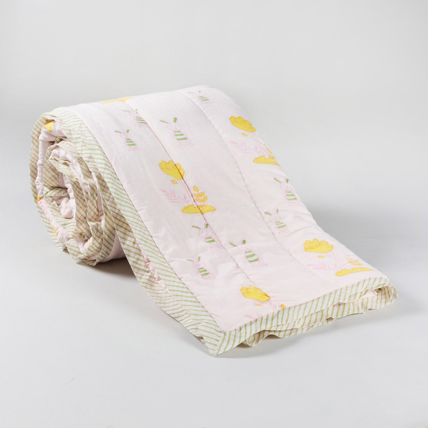 This quilt features a playful design. The repetitive bunny and tree motifs are hand block printed on breathable cotton. It ensures both comfort and durability. The soft pink base and gentle tones create a calm and cozy feel. The reversible finish of the quilt makes it easy to style. Suitable for kids’ beds or a light layering.
