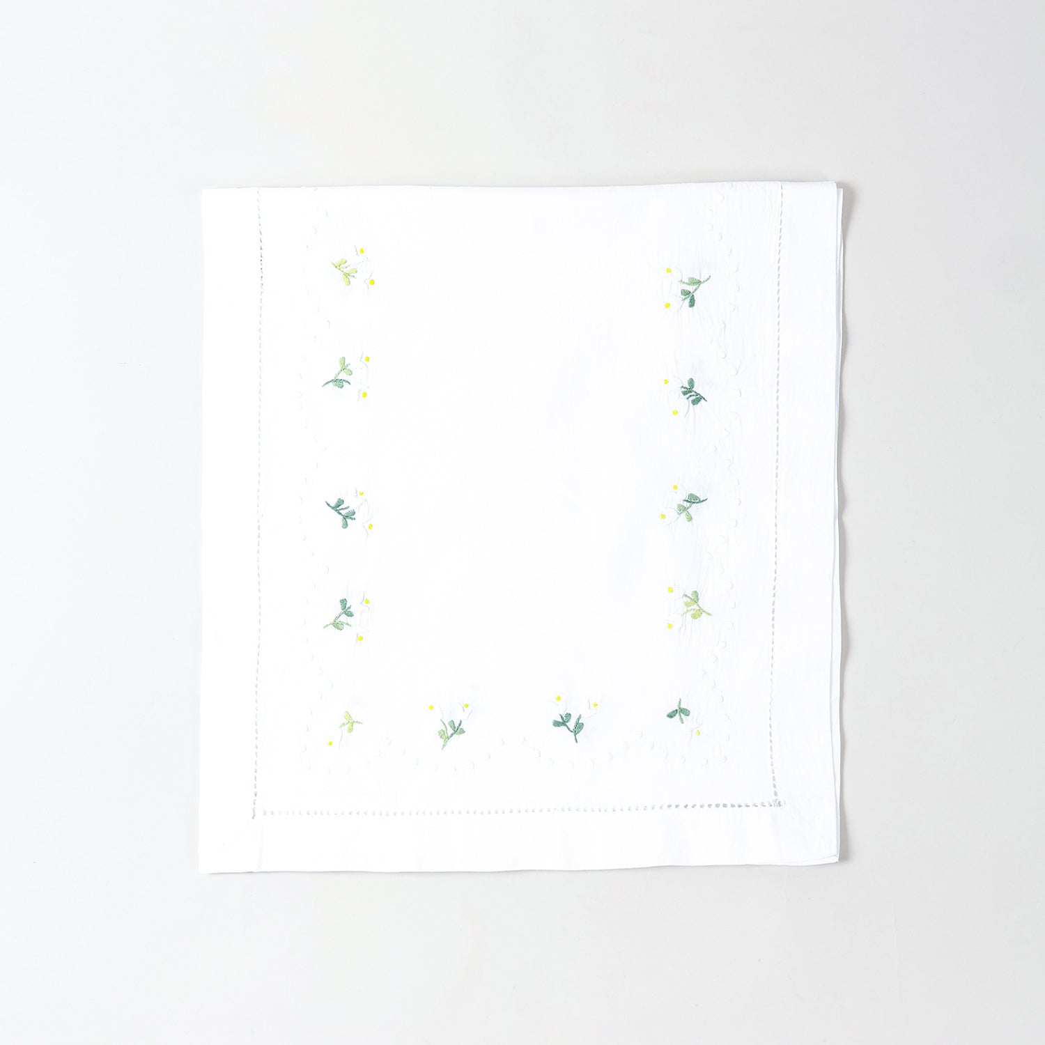 Featuring embroidered daisies in white and green, this Bengal chikankari table runner on white cotton brings freshness to your dining décor.