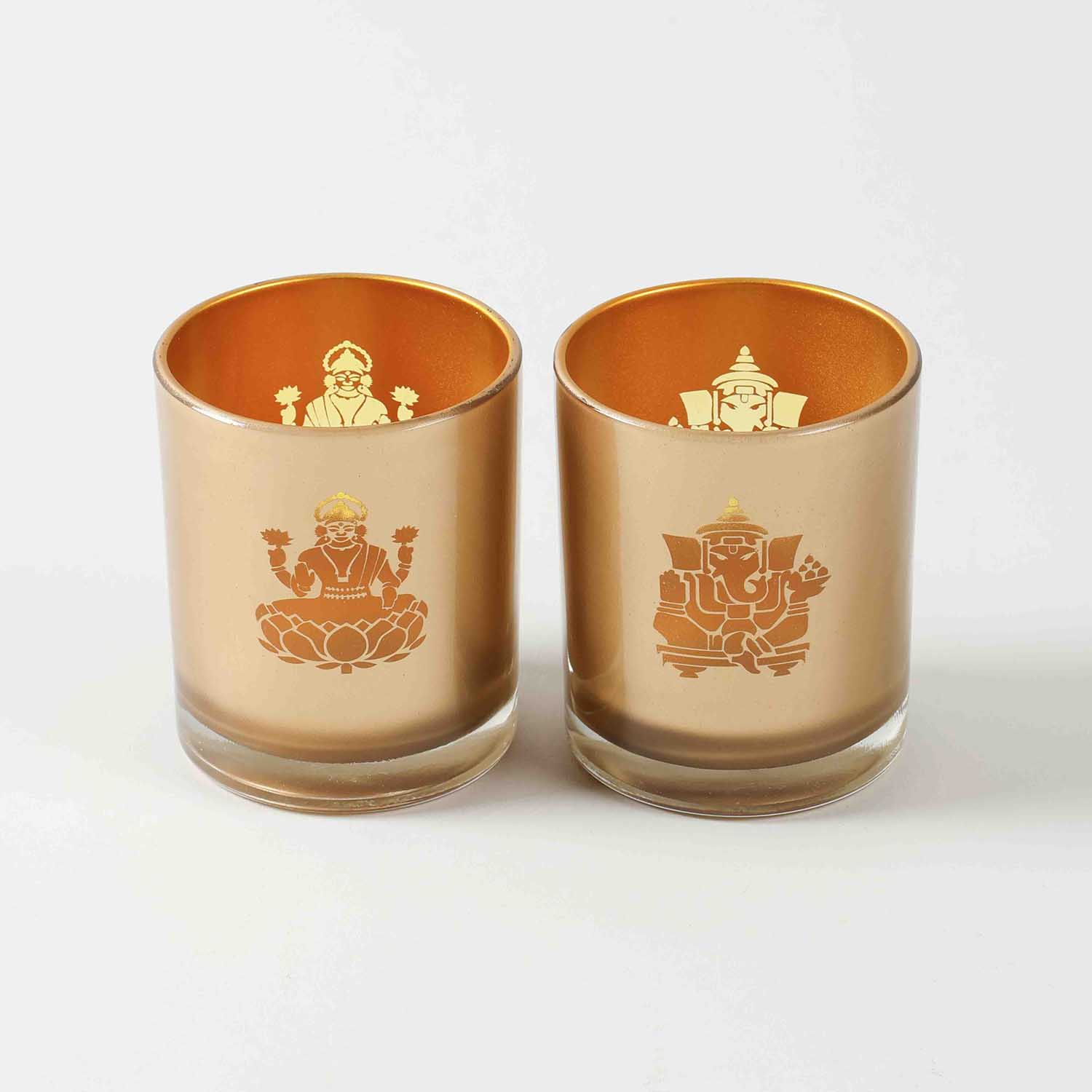 Celebrate the festive spirit with this set of golden glass candle holders adorned with Laxmi and Ganesh motifs. Symbolising prosperity and wisdom, they make your space glow with positive energy. Thoughtfully packed in a cardboard gift box, these holders are ideal for festive décor or auspicious gifting.