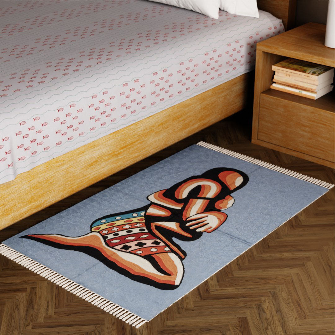 This woollen rug features a soothing grey base with an abstract depiction of a mother and child. The minimal design create a modern yet emotional artwork perfect for bedrooms, nurseries, reading corners, or meditation spaces. A meaningful piece that adds warmth and expression.
