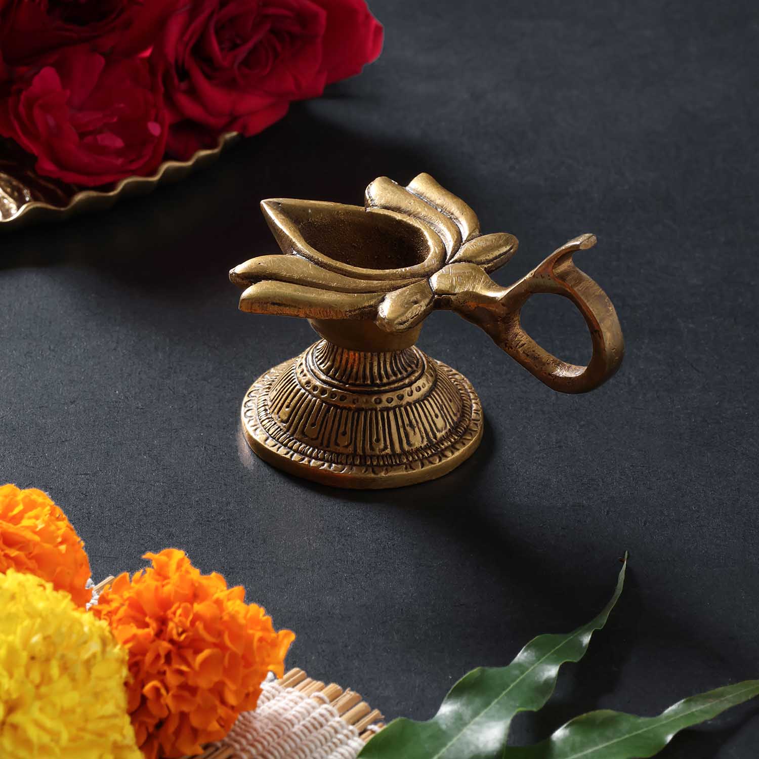 Lotus shaped brass diya with leaf base; sacred bloom brings divine radiance. The diya comes with a handle.