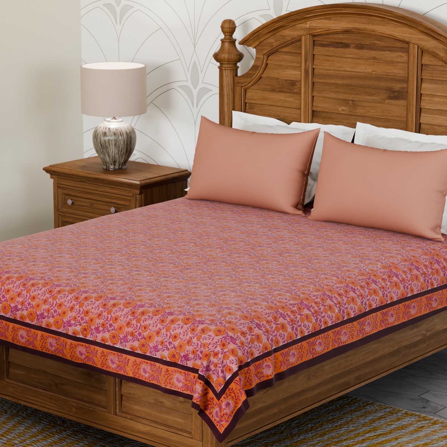 King-size bedcover in cotton sheeting with pink and orange marigold jaal. Hand block printed for timeless charm and everyday comfort.