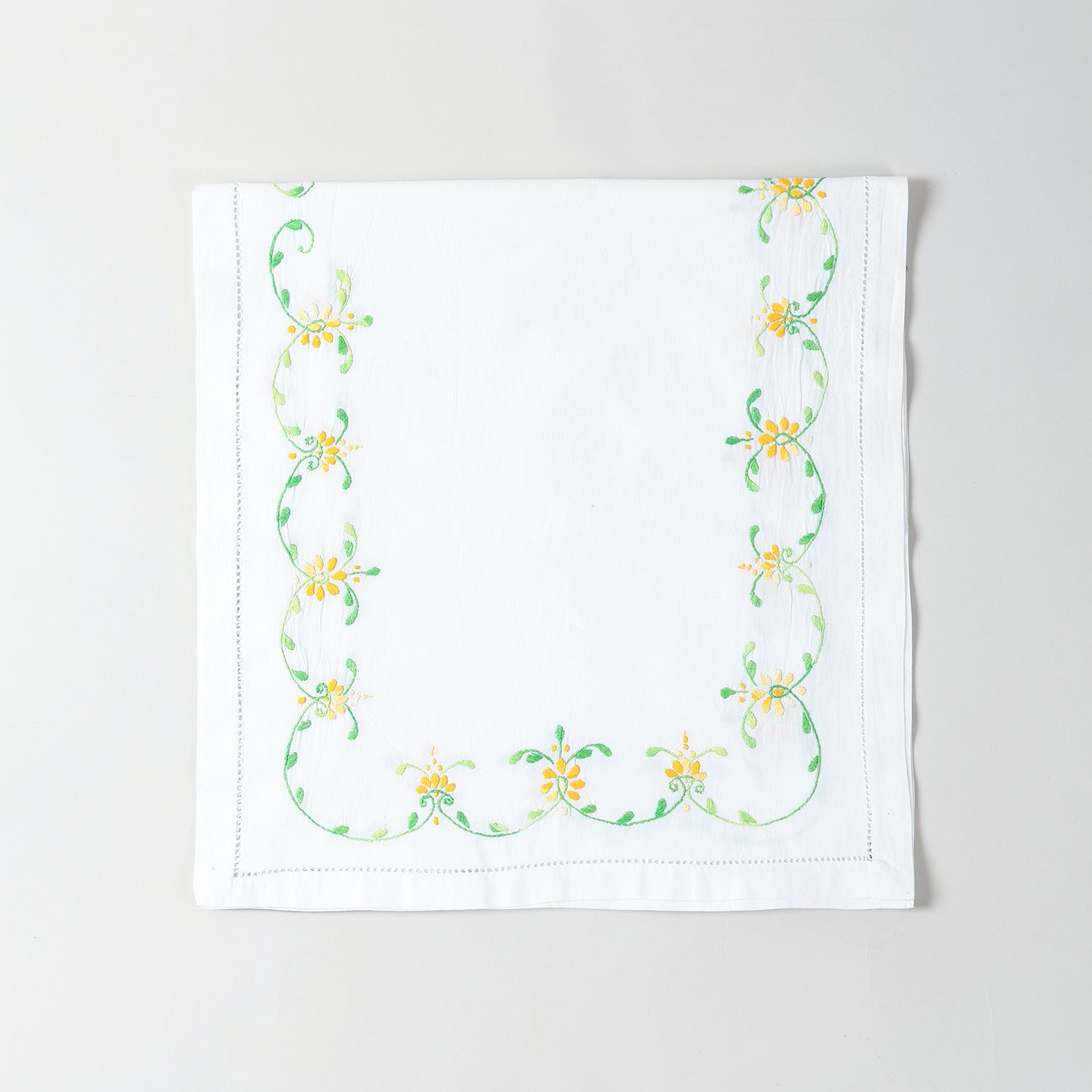 Crafted in Bengal chikankari, this white cotton table runner features orange and green floral embroidery, adding freshness to everyday meals.