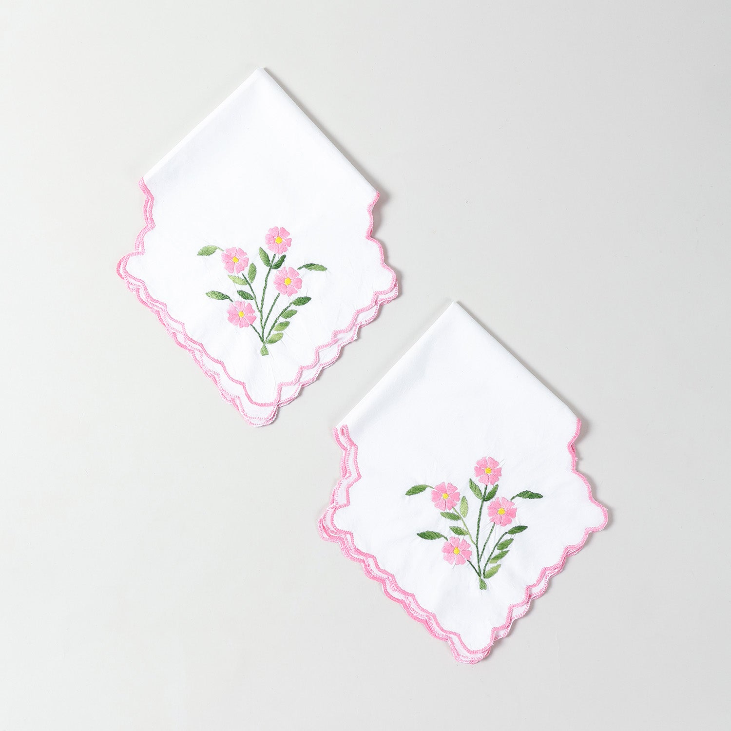 A pair of 16"x16" white cotton chapati cloths, embroidered with pink daisies in Bengal chikankari embroidery.