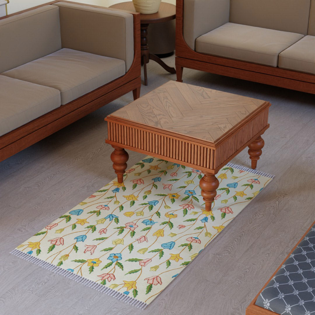 This rug is filled with delicate floral motifs multi-colour agains soft pinks base, all done in detailed chain-stitch work. The cheerful palette makes it ideal for bright, cosy rooms like bedrooms or creative spaces.