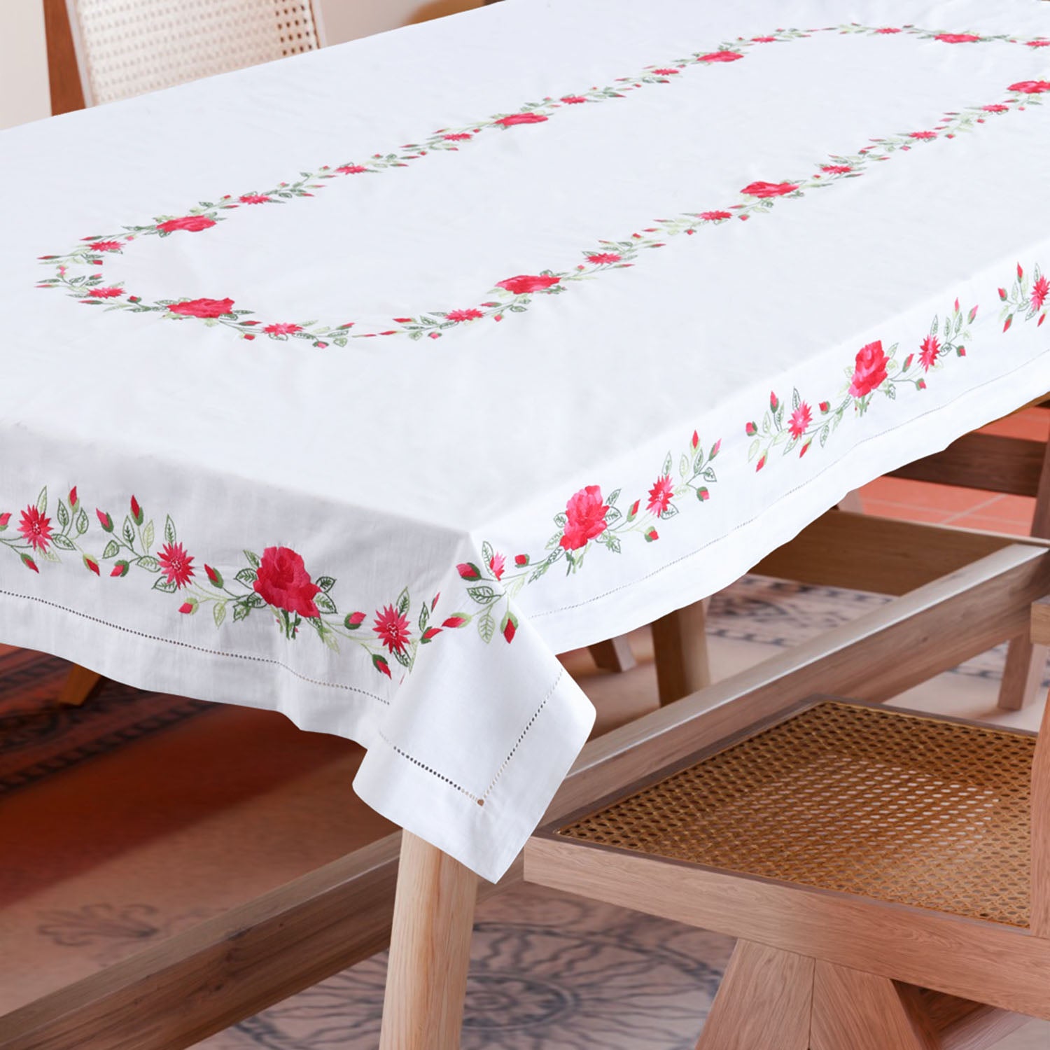 Handcrafted in Bengal chikankari on white cotton, this tablecloth features poinsettia-inspired red and green embroidery. It comes with delicate cutwork - a festive centrepiece for family dining.