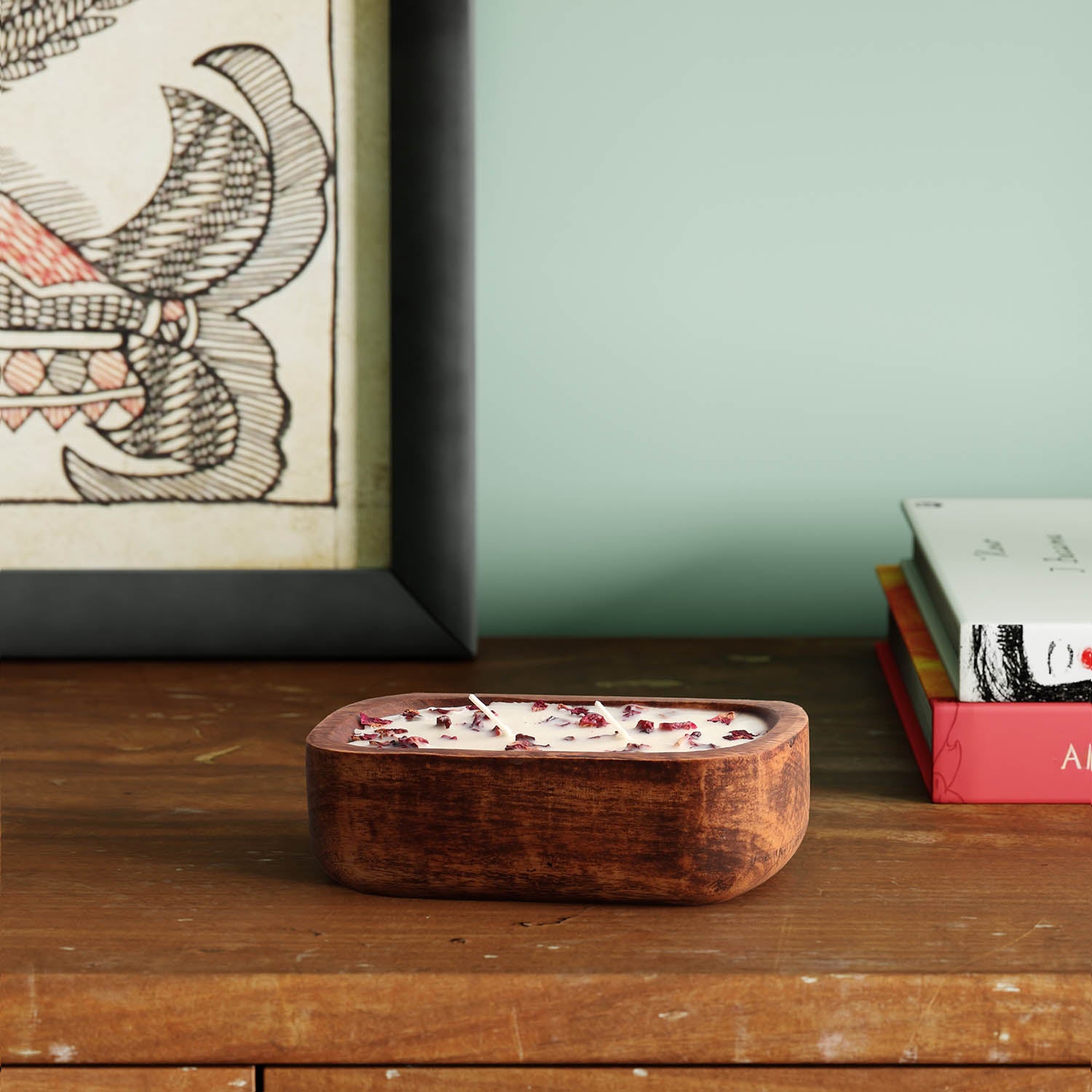Hand-poured soy wax candle in a carved wooden tub. Natural finish and soft fragrance of rose create a warm, eco-friendly glow for your living space.