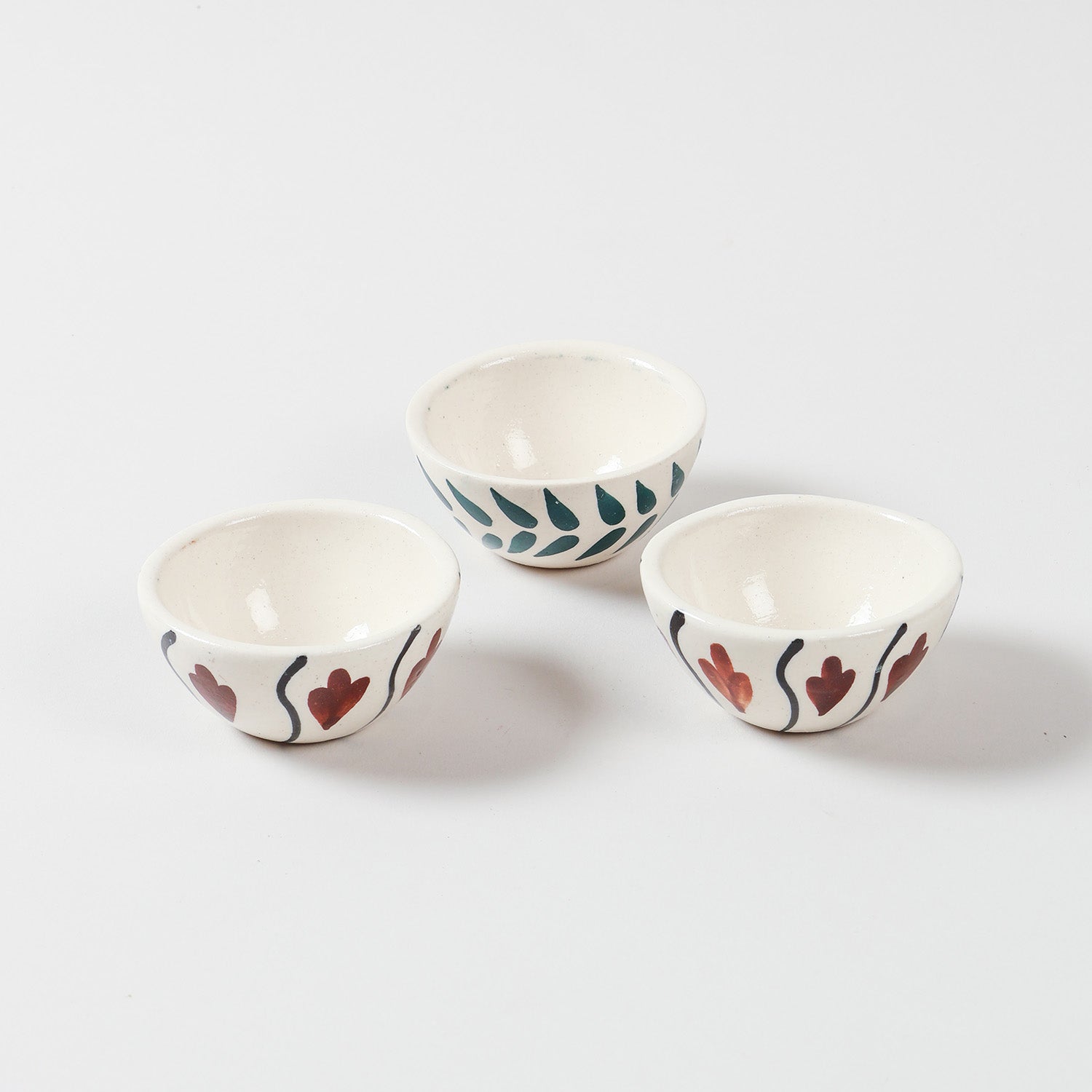 Classic and timeless, this set of 3 small round ceramic bowls (2.5 inches wide, 1 inch deep) is finished in glossy off-white and multi coloured patterns. One bowl is decorated with dark green teardrop-shaped leaf motifs around the rim. The other two bowls feature a red floral pattern, connected with flowing black lines. Ideal for serving dips or sauces elegantly.