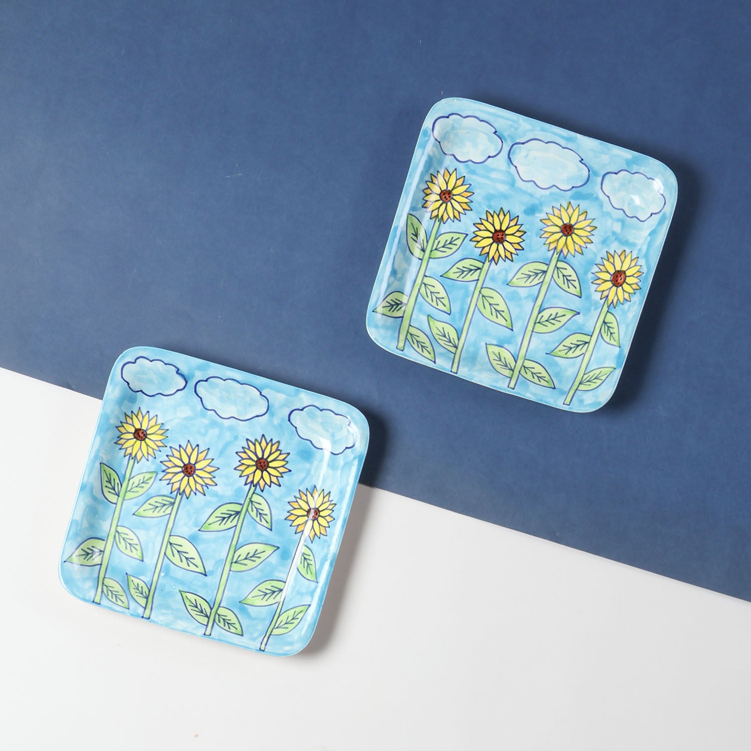 Brighten your table with this delightful set of two hand-painted Khurja Ceramic Sunflower Square Platters. Each platter is a vibrant celebration of artistry, featuring cheerful sunflowers meticulously hand-painted by skilled artisans from Khurja, India.