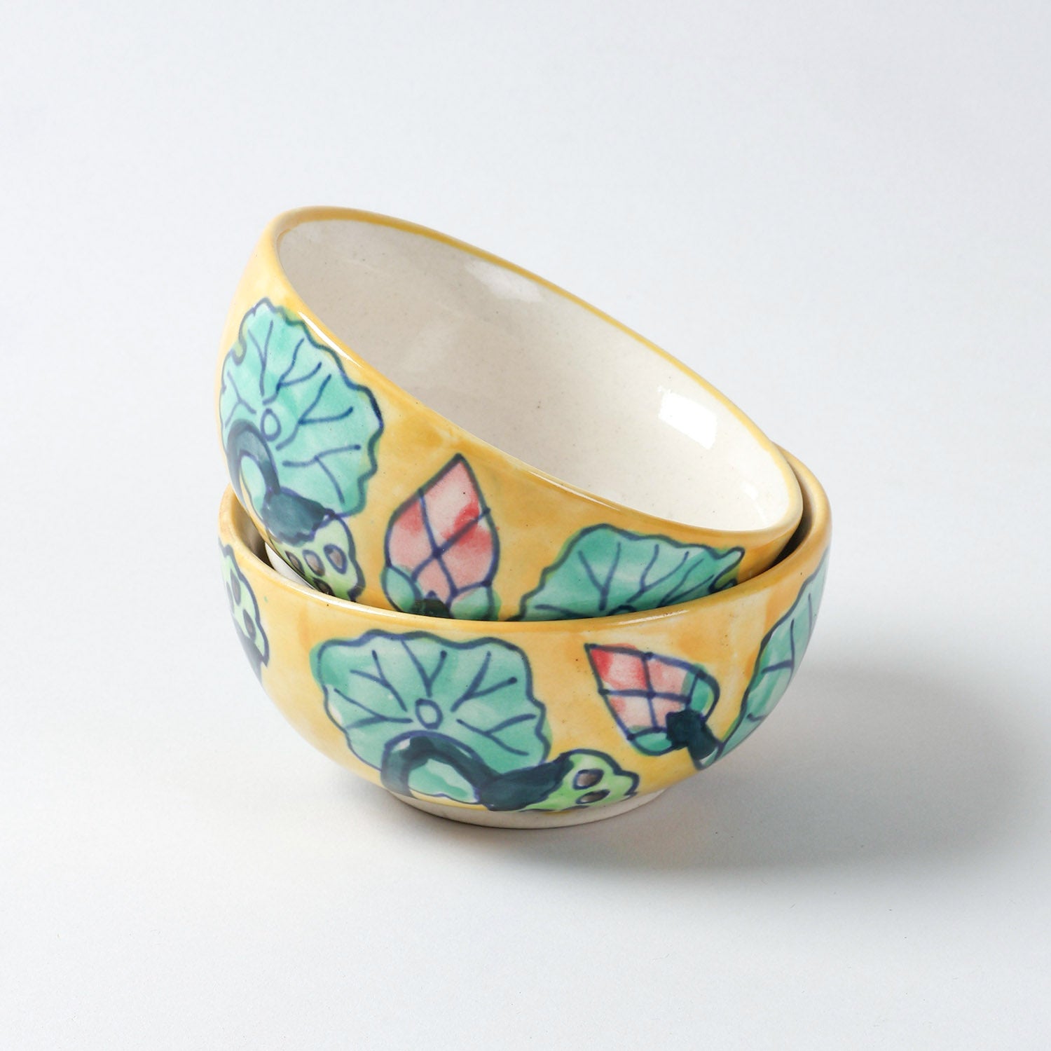 Elevate your tableware with this hand-painted Waterlily Katori Set, crafted by skilled artisans from Khurja, India. Made from durable ceramic, each katori features delicate waterlily motifs in soothing, vibrant hues. Perfect for serving snacks, desserts, or condiments, it adds an elegant artisanal touch to everyday dining.